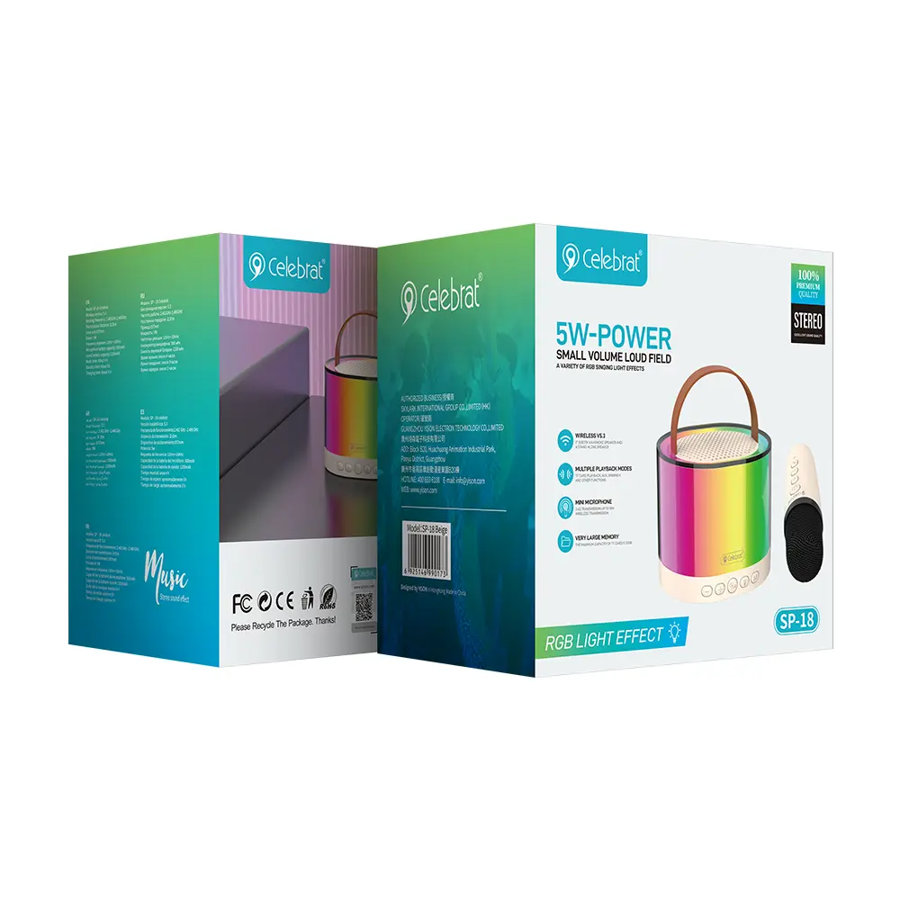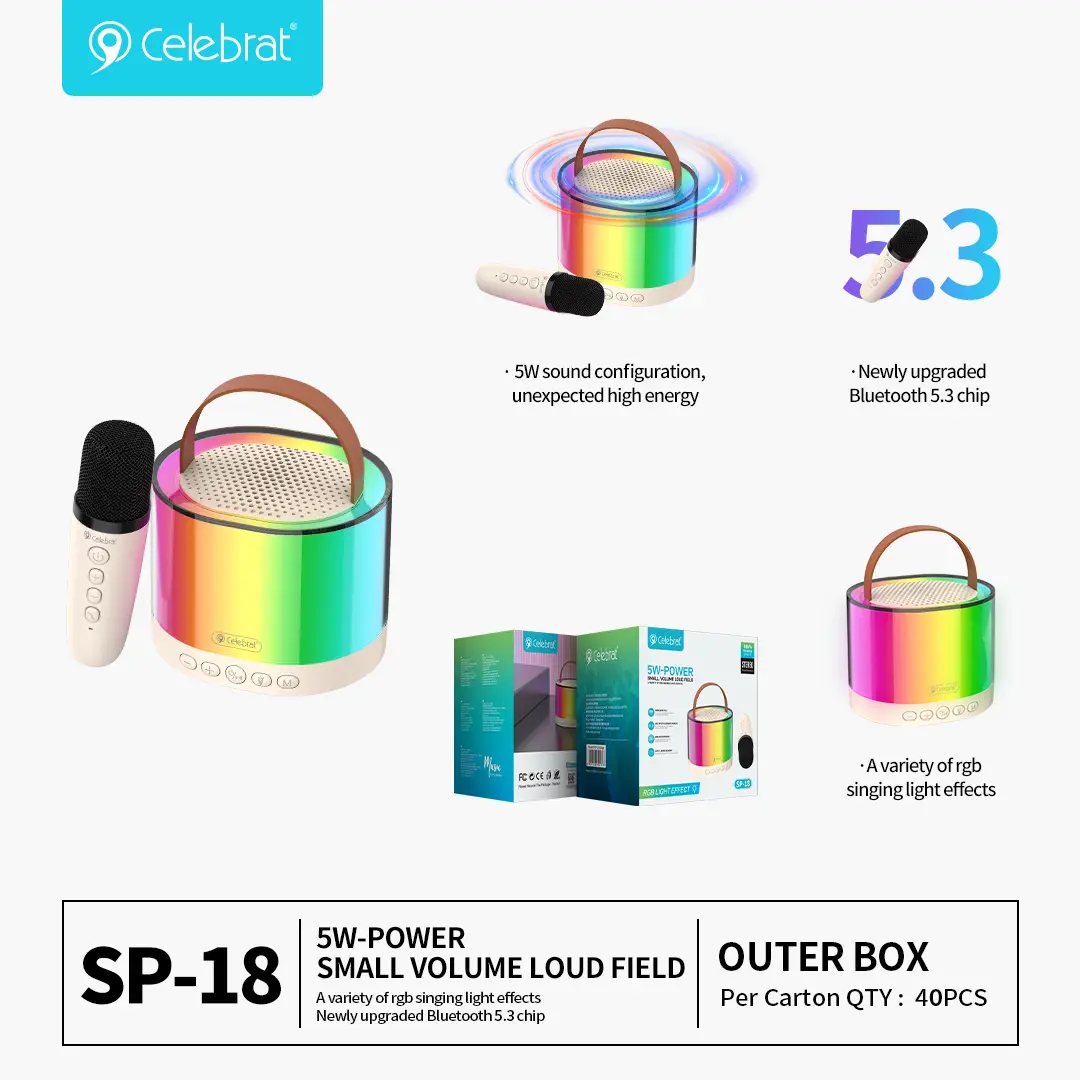 Despite its compact size, the speaker delivers powerful 13 5W sound, driven by a 1457mmunit and a dedicated bass diaphragm for rich, clear audio.15To set the perfect mood, it features dynamic RGB Light Effectsthat pulse and dance to the beat of your music.16With multiple connection options (Bluetooth 17V5.3, AUX, USB, and TF Card) and a 181200mAhbattery, the Celebrat SP-18 offers versatile and engaging entertainment wherever you go.19