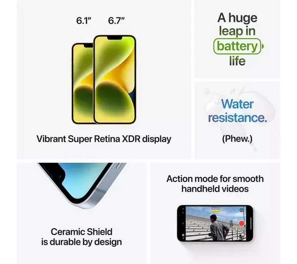 The Apple iPhone 14brings significant camera and safety upgrades to the standard iPhone line.1It features a stunning 6.1-inch Super Retina XDR OLED displayand is powered by the fast, efficient A15 Bionic chip(the enhanced version with a 5-core GPU).2The camera system is a major highlight, introducing a new, larger main sensor (3$f/1.5$aperture) and the Photonic Enginefor dramatic improvements in low-light photography across both the rear and front TrueDepth cameras.4 For your safety, the iPhone 14 includes groundbreaking features like Crash Detection and Emergency SOS via Satellite (where available). With excellent all-day battery life, 5G connectivity, and the Ceramic Shield front cover for enhanced durability, the iPhone 14 is a fantastic choice for users seeking premium performance and flagship-level camera quality without the Pro price tag
